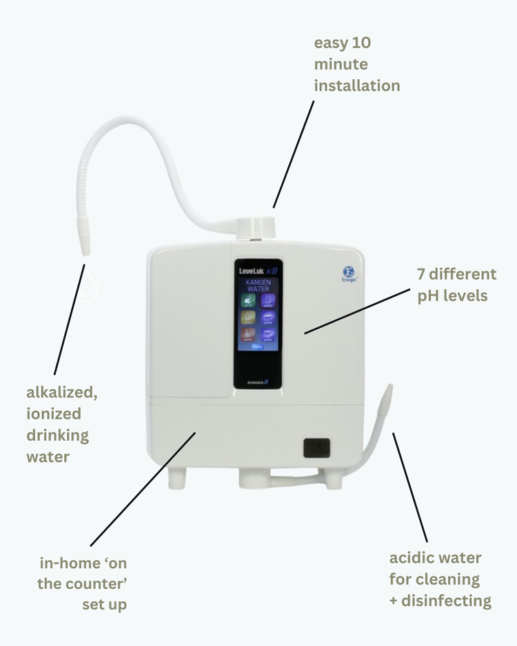 Active Molecular Hydrogen Water is created using innovative ionization water technology through an on the counter kitchen appliance. Electrically enhancing your tap water, by producing ionized alkalized and acidic water through a process called electrolysis. These waters can be used for various purposes including drinking, cooking, beauty, and cleaning. These ionizer machines offer seven different PH levels of ionized water that can be used in over 60+ ways. The drinking water ranges from 8.5-9.5pH, depending on the type of water you select on the machine’s touch screen. Although there are many therapeutic benefits of drinking ionized water, the three key components are the high levels of active molecular hydrogen, the minerals it contains and the optimal hydration it offers.